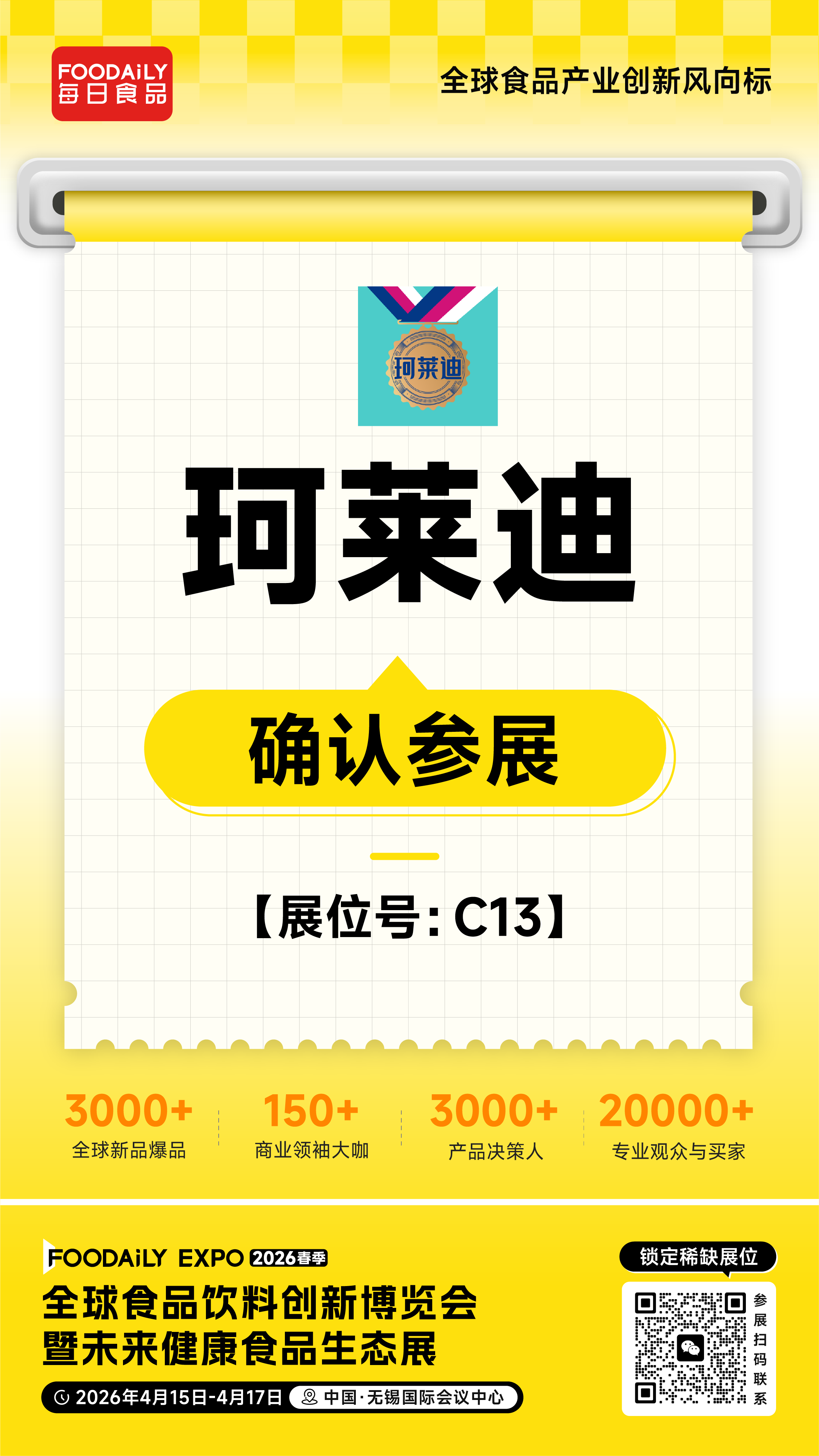 在众多参展力量中,展会迎来一则重要动态——低GI控糖生活专家【珂莱迪】已正式确认参展!作为专注低GI低升糖食品领域的品牌,珂莱迪的加入将为这场创新盛会注入更多优质资源与控糖食品创新理念,与全球同仁共话健康食品产业的未来图景。