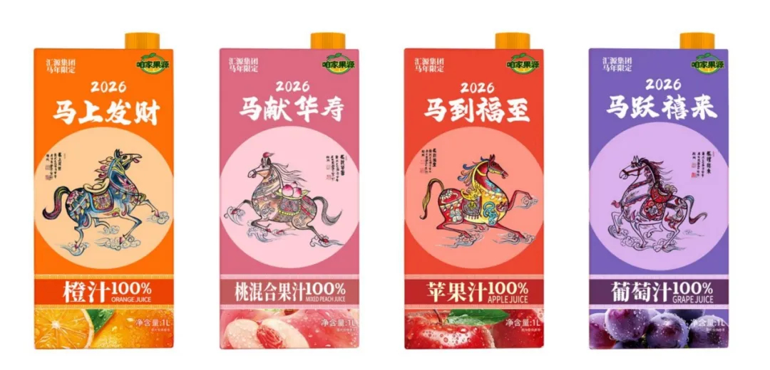 近日,汇源推出全新品牌“咱家果源”,并同步上市“福禄寿禧”马年限定款100%果汁系列新品。据官方介绍,该限定系列为汇源集团与中国印象岩画艺术家张学智的联名产品。包装以传统绘画为设计载体,呈现“彩马载福”视觉主题,并融入“福禄寿禧”文化意象,对应“马到福至”“马上发财”“马献华寿”“马跃禧来”四款主题画面,分别搭配橙、桃、苹果、葡萄四种经典口味的100%果汁。
