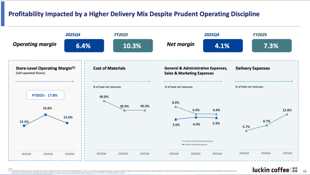 此外,对于第四季度的利润等关键指标下滑,郭谨一表示,外卖平台补贴力度在行业淡季明显收缩,外卖占比虽环比有所下降,但仍处在较高水平。综合以上因素,四季度自营同店销售增长率回落至1.2%,营业利润约8.2亿元。