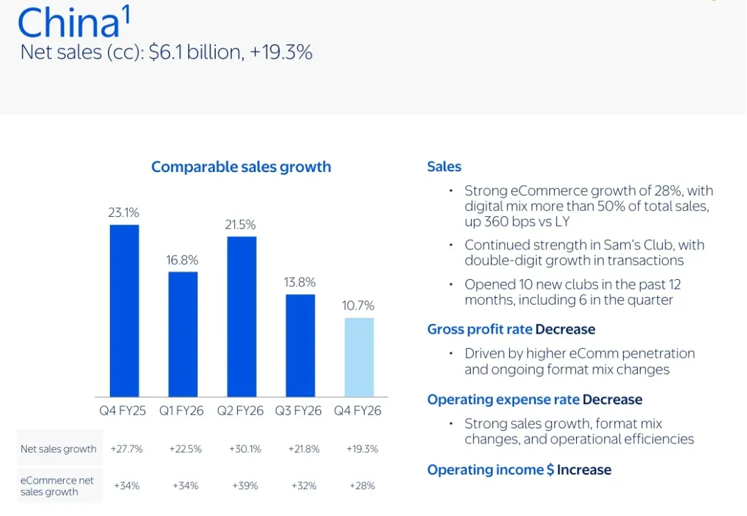其中,沃尔玛中国2026财年全年净销售额约为247亿美元(折合人民币约1701亿元),同比增长约21.67%;第四季度,净销售额为61亿美元(折合人民币约420亿元),同比增长19.3%。虽然受到春节旺季延后的影响,第四季度可比销售额依然录得10.7%的稳健增长。山姆会员商店第四季度继续保持强劲的发展势头,交易单量达双位数增长,2025年新增10家门店,其中第四季度新增6家。此外,沃尔玛中国第四季度电商业务继续保持28%的强劲增长,电商销售额占比已突破50%。