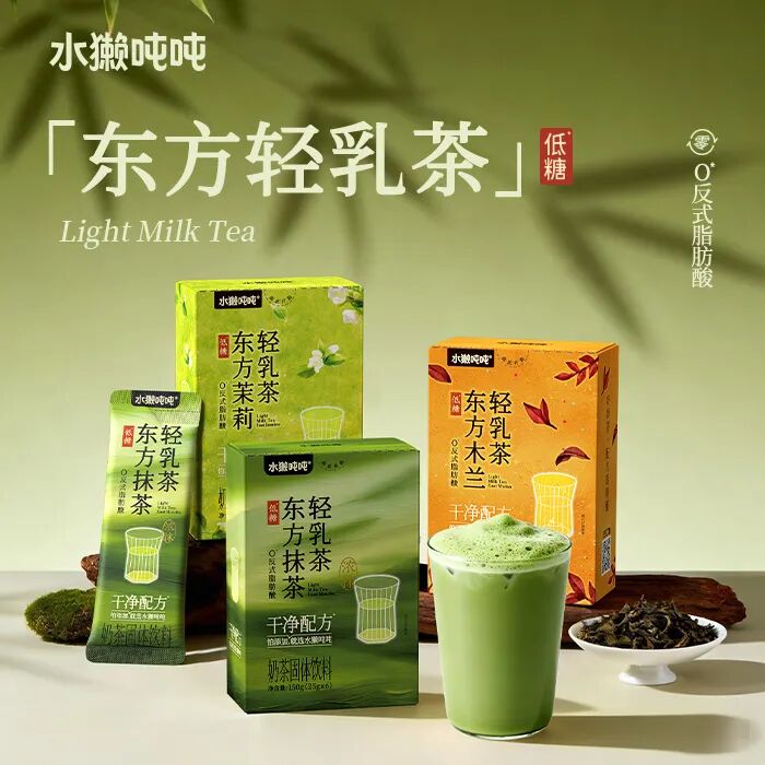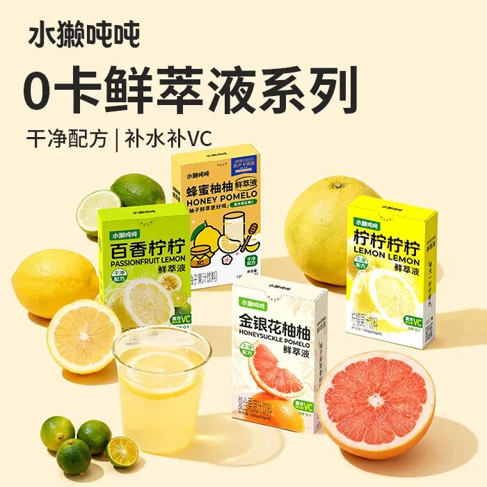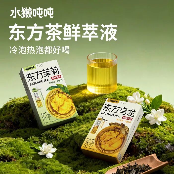目前水獭吨吨的产品主要涵盖鲜萃液、茶鲜萃液、轻乳茶三大系列:百香柠柠、金银花柚柚等鲜萃液以0卡、0代糖和果糖分离技术为核心,口感清爽补维C,适配不同季节需求;东方茉莉茶鲜萃液采用优质茉莉七次窨制,0糖0香精、冷热即溶;轻乳茶选用100%纯牛乳,搭配原叶茶,0植脂末,热量不足百卡,口感浓郁又轻负担。