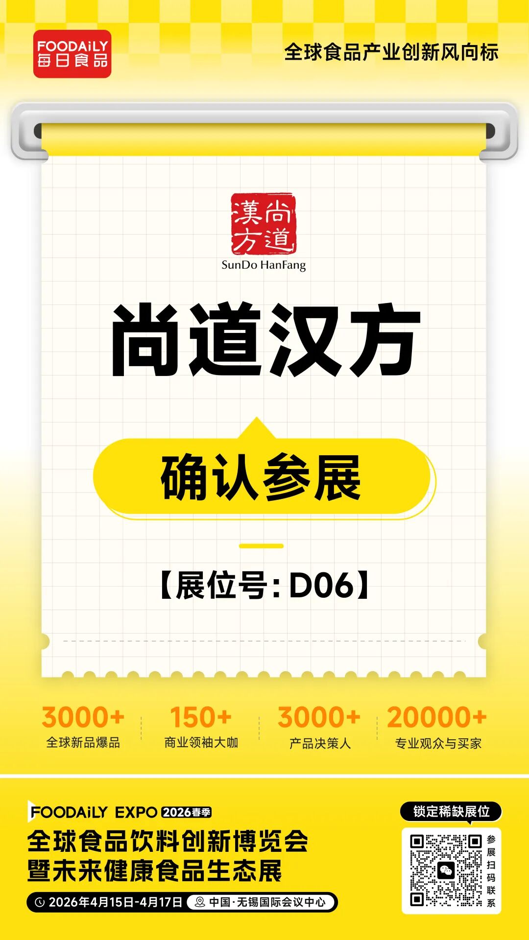 2026 Foodaily创新博览会,尚道汉方将携科技汉方全案智造成果亮相无锡国际会议中心,D06展位,与各界伙伴携手,以现代科技赋能传统汉方创新,共筑科学化、智能化、高品质的大健康产业新未来。