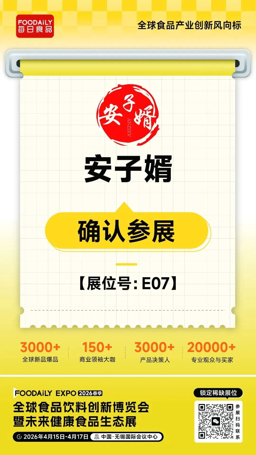 2026 Foodaily创新博览会,安子婿将携旗下明星产品亮相于无锡国际会议中心,E07展位,邀各界伙伴共探乳制品行业全渠道运营与创新新趋势。