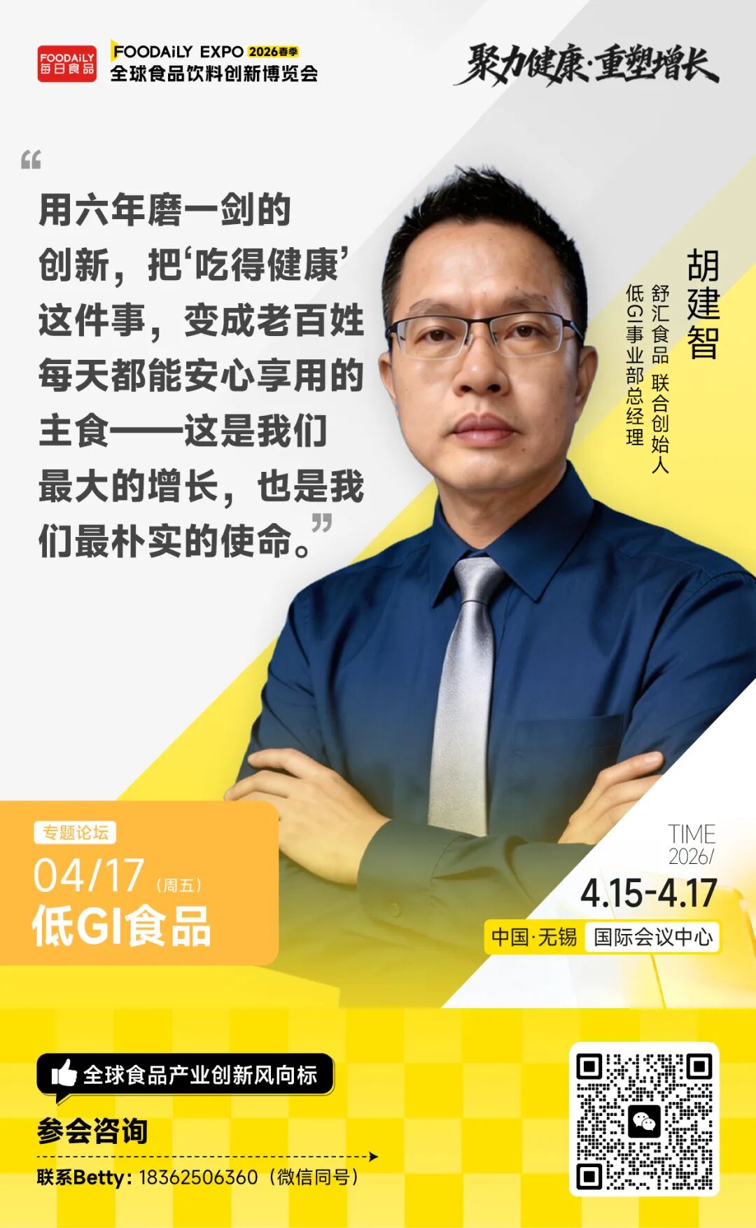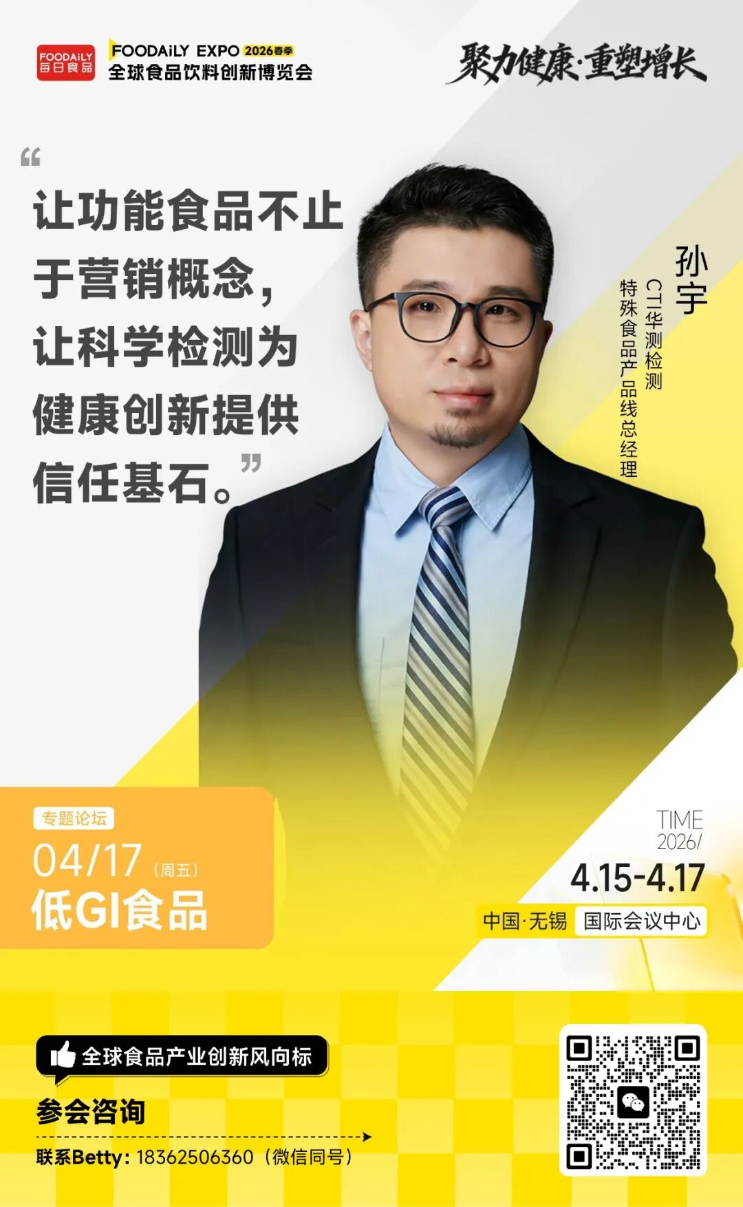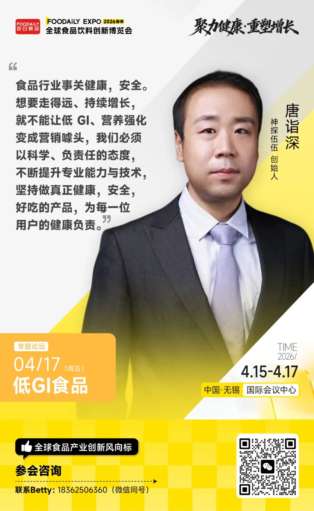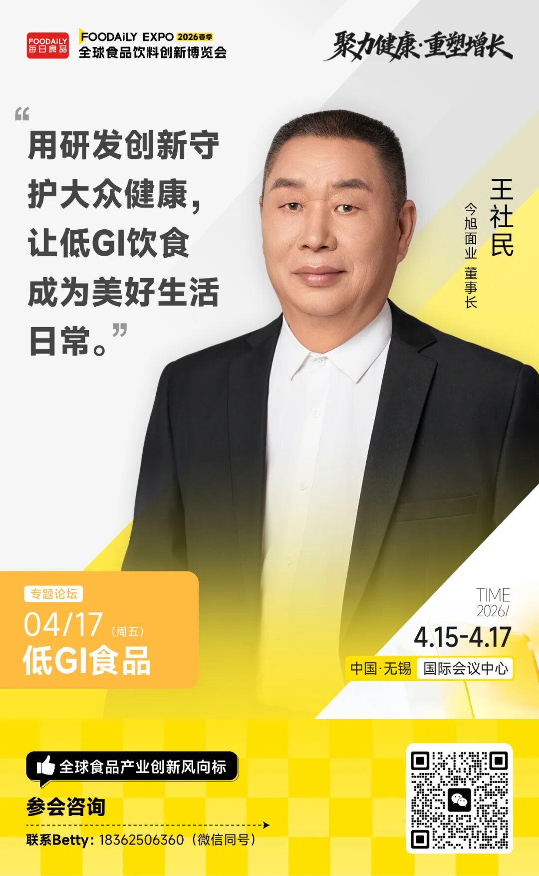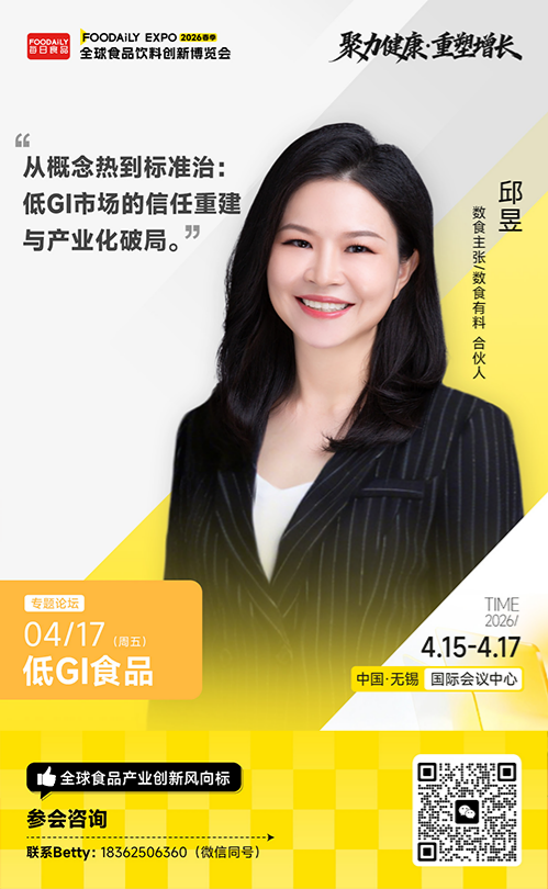 今旭面业董事长王社民、舒汇食品联合创始人、低GI事业部总经理胡建智、CTI华测检测特殊食品产品线总经理孙宇、数食主张/数食有料合伙人邱昱等五位嘉宾将一同聚焦标准、技术与商业之间的多重博弈,探讨在信任缺失与需求爆发并存的当下,低GI行业如何完成从合规到立信的跨越,并寻找下一阶段的增长突破口。