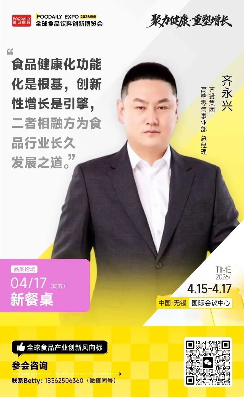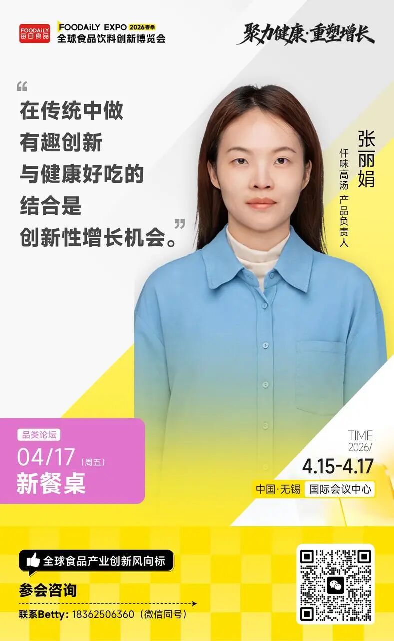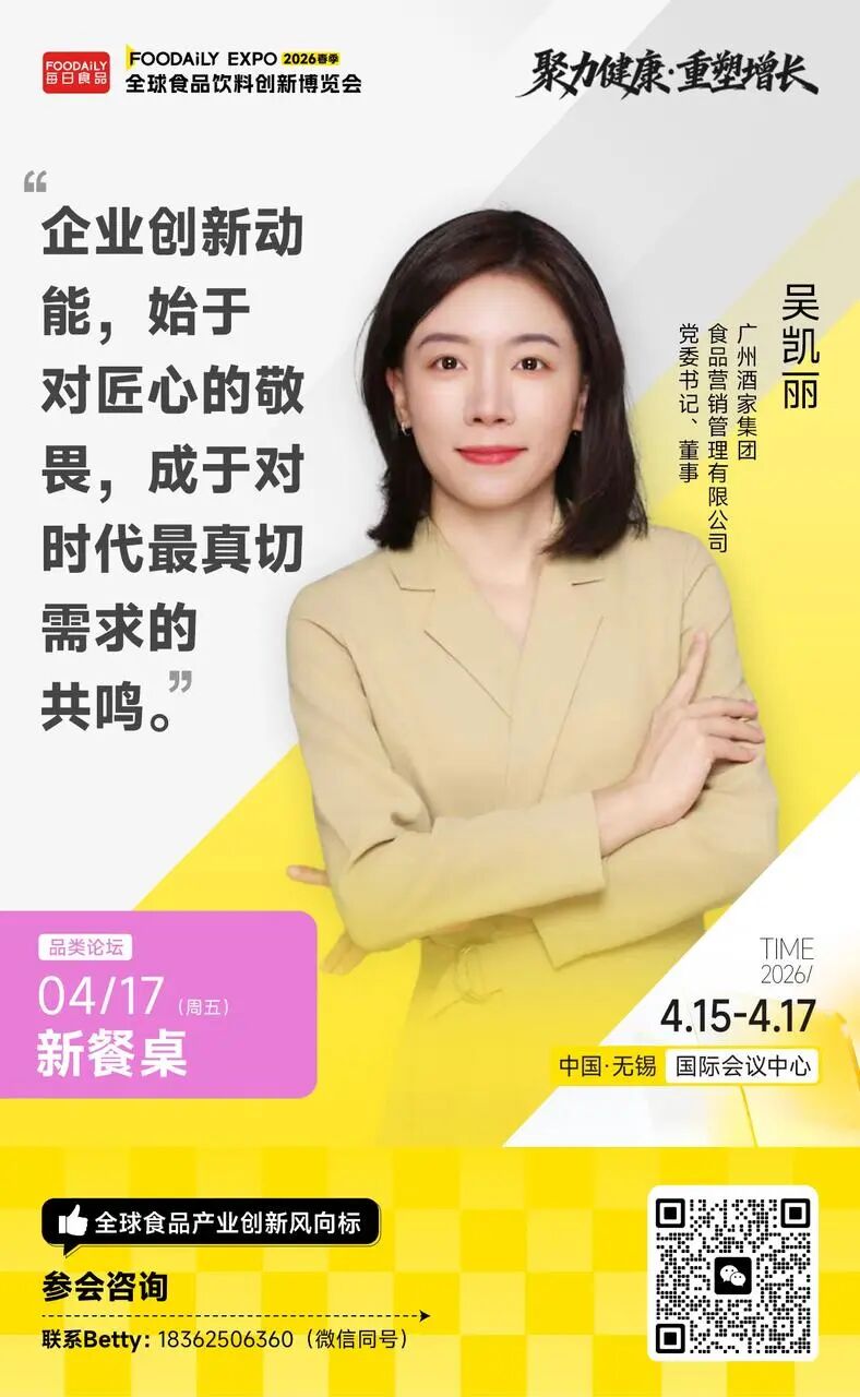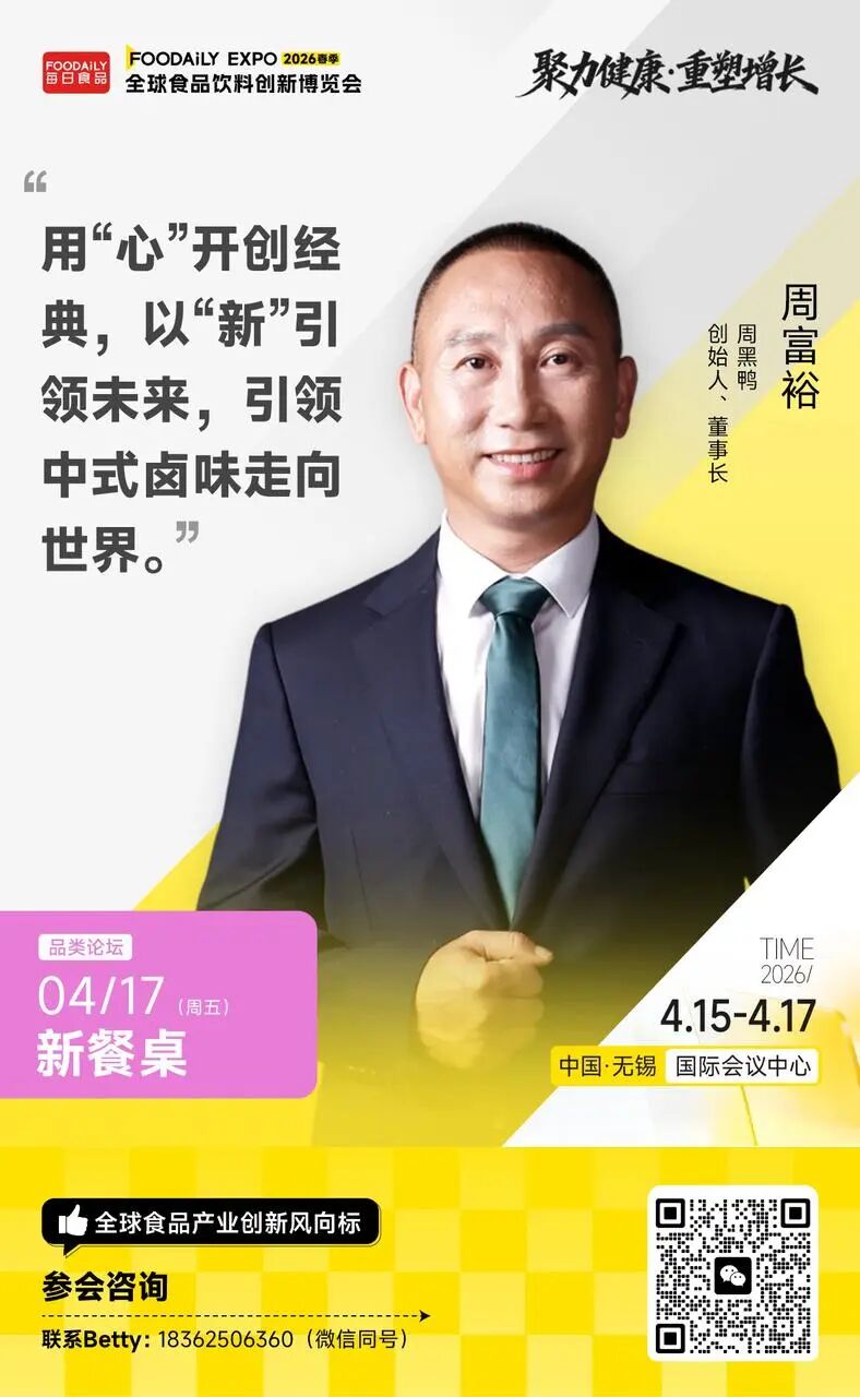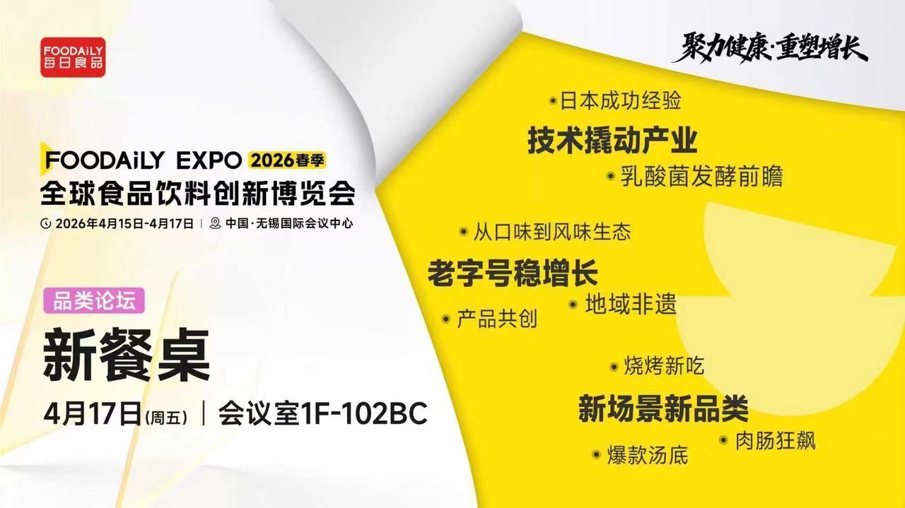 以「聚力健康 · 重塑增长」为主题,2026 Foodaily全球食品饮料创新博览会将于2026年4月15日-17日,在中国·无锡国际会议中心举行。在4月17日「新餐桌」品类分论坛中,我们邀请到周黑鸭、六必居、广州酒家、味好美、齐赞集团、仟味高汤等头部品牌,以及中国工程院院士谢明勇、日本咕嘟妈咪等顶尖专家,将系统解构这场餐桌变革的逻辑与路径,与品牌共同探讨如何克服新变迁下带来的挑战,抓住餐饮品类发展的潜在机遇。