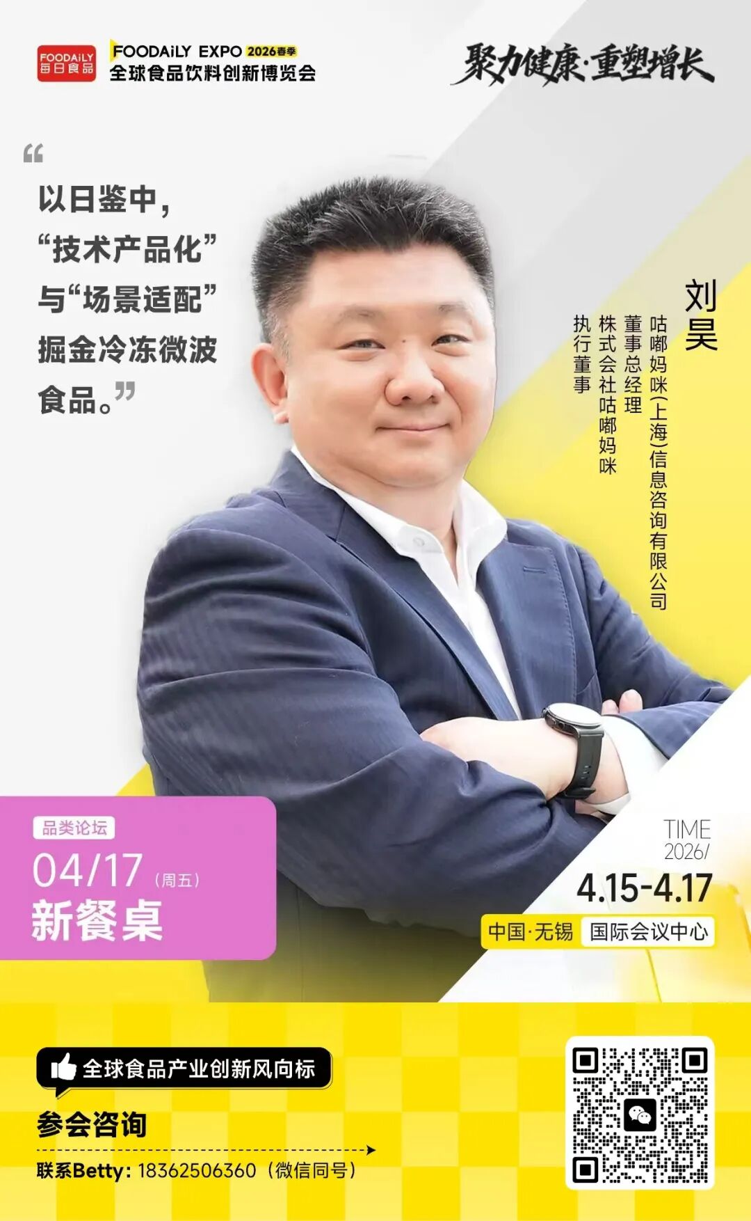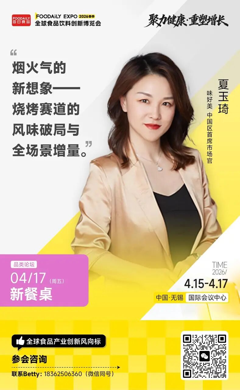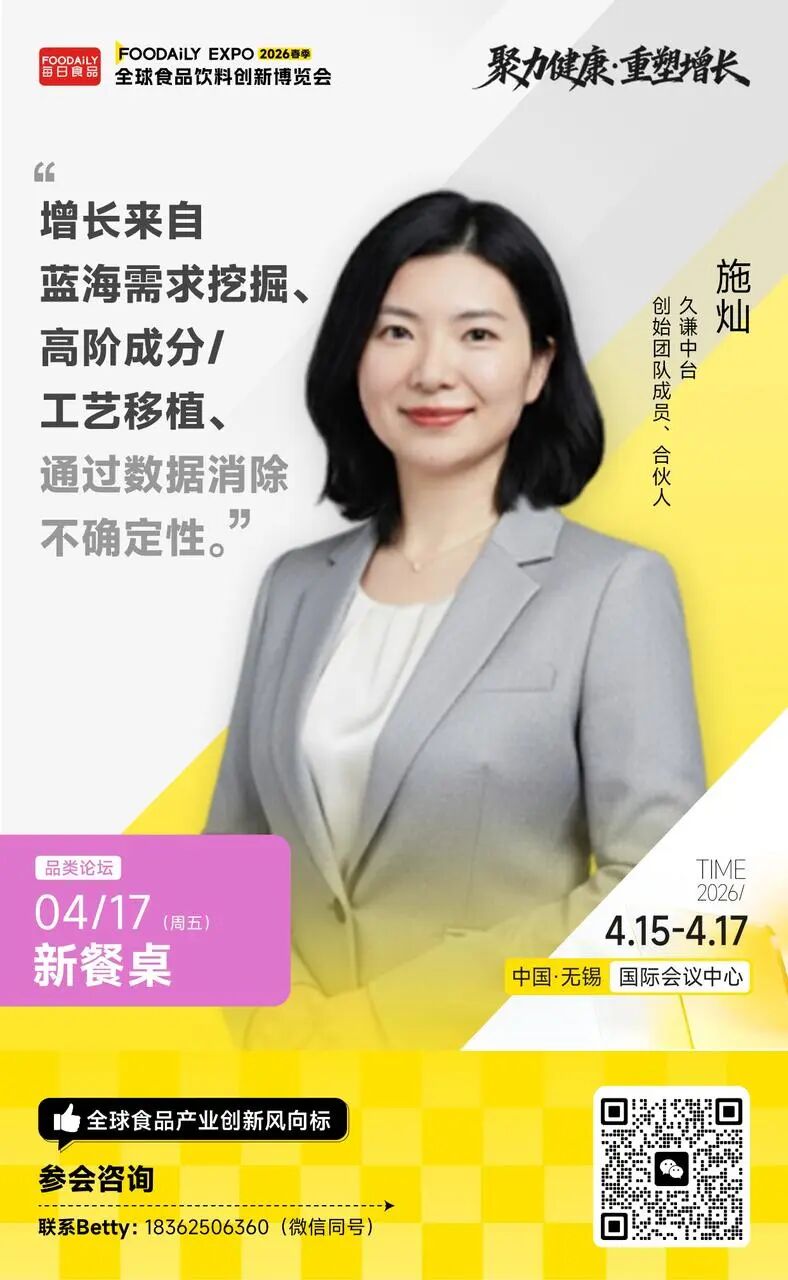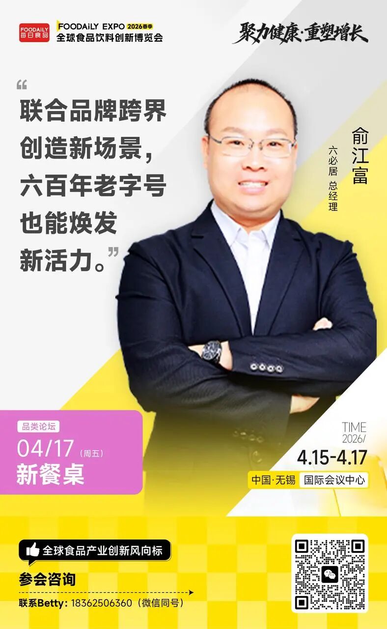 以「聚力健康 · 重塑增长」为主题,2026 Foodaily全球食品饮料创新博览会将于2026年4月15日-17日,在中国·无锡国际会议中心举行。在4月17日「新餐桌」品类分论坛中,我们邀请到周黑鸭、六必居、广州酒家、味好美、齐赞集团、仟味高汤等头部品牌,以及中国工程院院士谢明勇、日本咕嘟妈咪等顶尖专家,将系统解构这场餐桌变革的逻辑与路径,与品牌共同探讨如何克服新变迁下带来的挑战,抓住餐饮品类发展的潜在机遇。