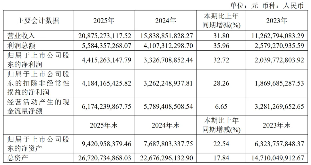 3月31日,东鹏饮料发布2025年年度报告。报告显示,2025年,公司全年实现营业收入208.75亿元,同比增长31.80%;归母净利润44.15亿元,同比增幅32.72%。公司可统计总动销量突破百亿瓶,成功实现年初既定目标。