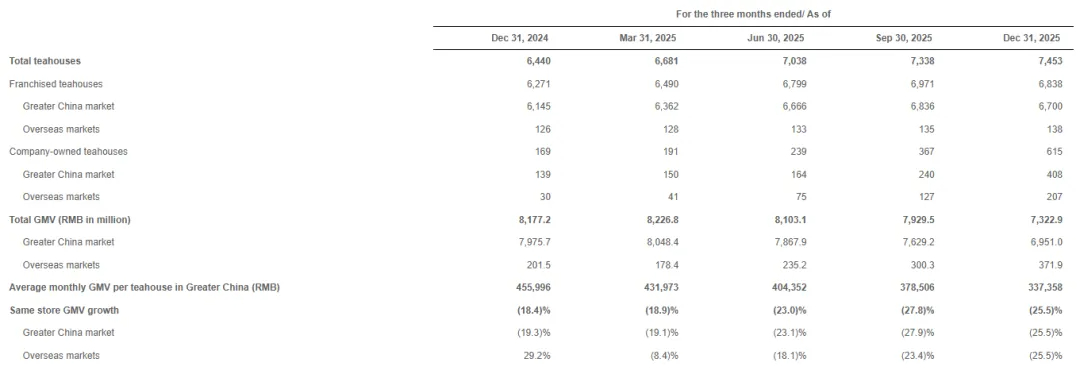 其中,在海外市场,公司第四季度GMV达3.7亿元,同比增长84.6%,环比增长23.9%,新增海外门店83家;海外GMV连续三个季度同比增长超75%,海外业务成为公司重要的增长引擎。截至2025年12月31日,在中国市场之外,霸王茶姬共有345家海外门店,覆盖东南亚、北美地区的7个国家。
