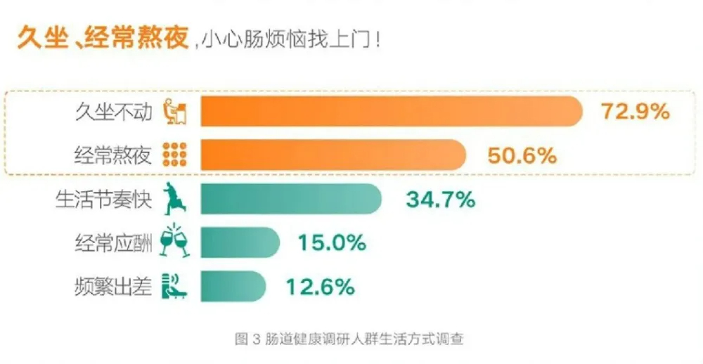 他们大多是身处一二线城市的社会中坚力量,覆盖了熬夜追剧党、轻运动久坐党、家庭中的 “状态管理者”三大细分人群。办公久坐、加班熬夜、作息不规律、精神压力大是他们的共同生活状态,也让他们长期处于职场亚健康状态:肠道蠕动速度大幅下降,便秘、腹胀、消化不良等肠道问题成为常态。