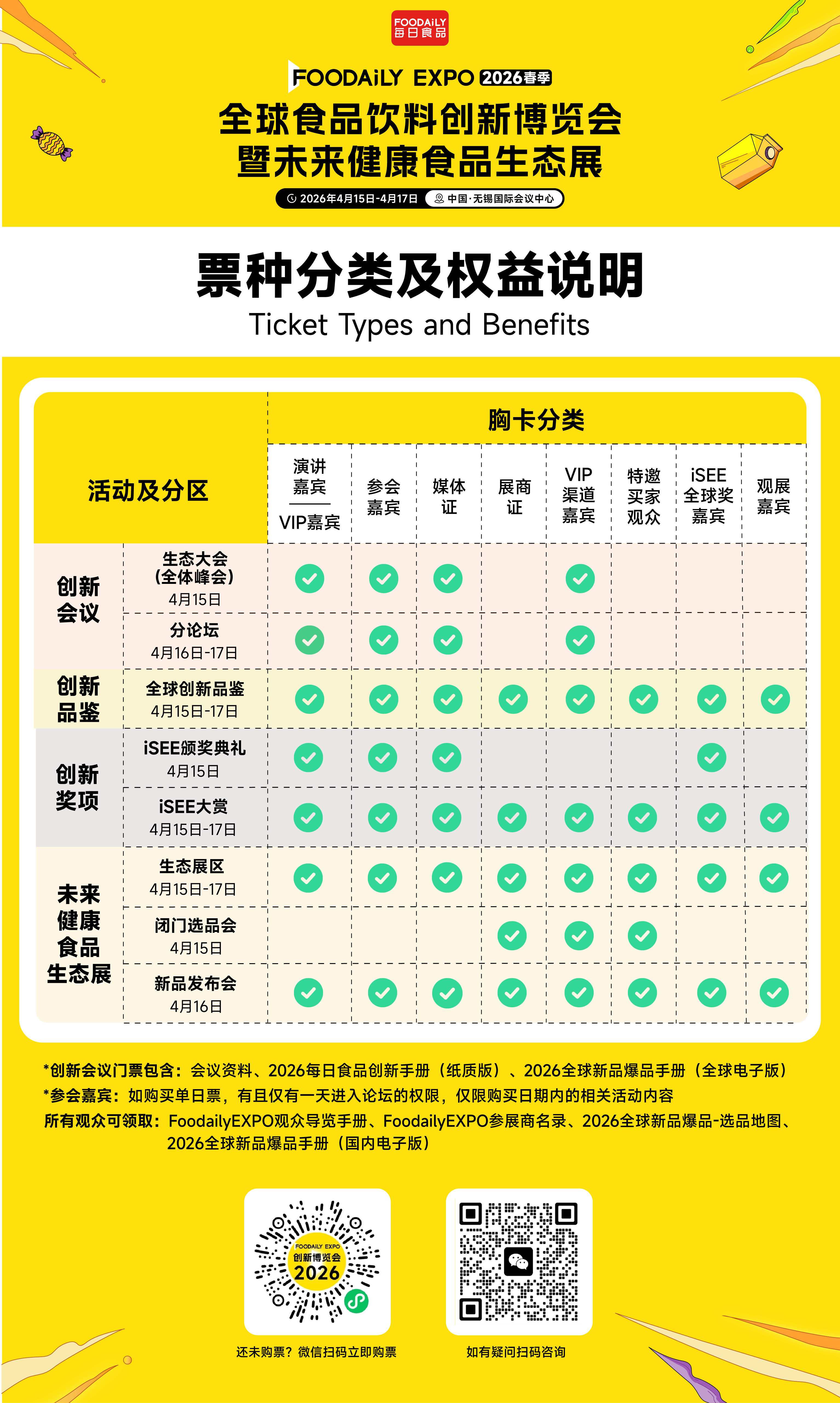 1)Foodaily创新博览会所有票种门票均为实名制且仅限本人使用,如需携带同伴进场,请另外购买门票;