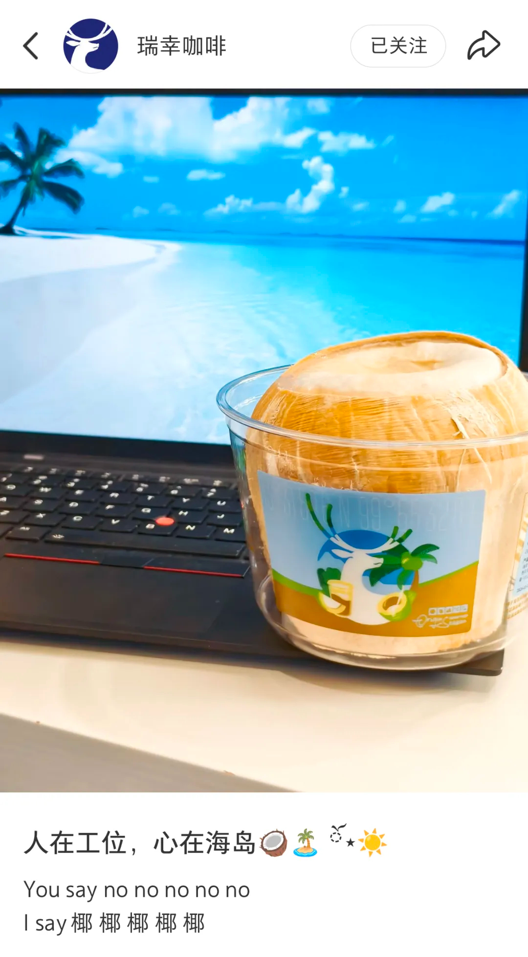 2021年5月,瑞幸火速签下因“不想上班,只想下班”出圈的利路修,让其作为冰咖推荐官去海南“上班”摘椰子,直接打开了生椰拿铁永远不下班,足量供应的话题度,同时推出了椰青冰萃咖啡、SOE耶加·生椰拿铁等4款新单品;