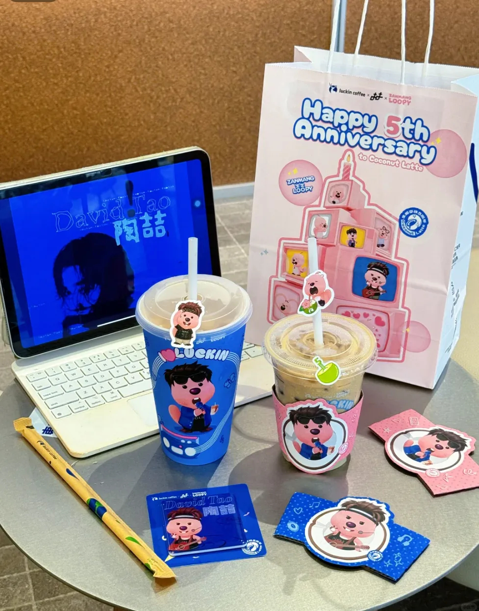 到了2026年4月,瑞幸玩出了咖啡茶饮界的首个三方联名——瑞幸×陶喆×Loopy。