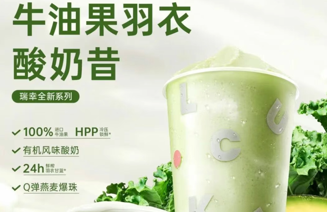 4月27日,瑞幸率先上市该系列“牛油果羽衣酸奶昔”,其核心卖点,100%进口牛油果,HPP冷压锁鲜工艺,以及24小时鲜榨羽衣甘蓝复合果蔬汁、有机风味酸奶,各个都踩在当下流行的风口上。