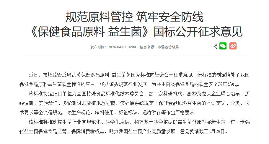 就在4月初,国家市场监督管理总局官网发布消息,就《保健食品原料 益生菌》国家标准向社会公开征求意见,从源头划定了严苛准入门槛:菌株鉴定必须到"株"、功效必须有临床试验、生产必须建立三级种子批系统。