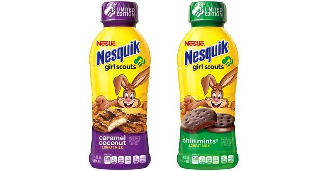 这些新推出的Nesquik低脂巧克力牛奶饮料将低脂巧克力牛奶和两种最流行的女童子军饼干风味结合在一起,创造出一个便携式的饮料。