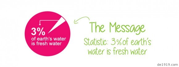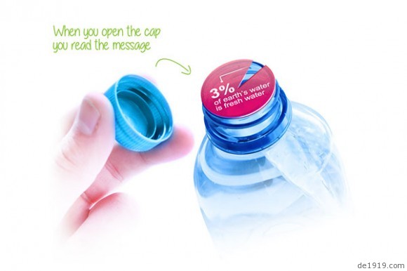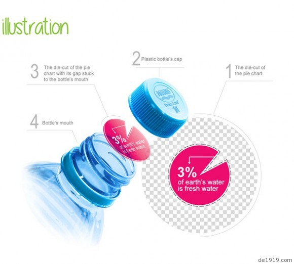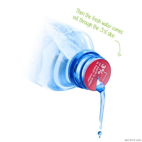 日益短缺的淡水资源是现今人类发展的一大难题,设计师把印有3% of earth’s water is fresh water(地球上仅仅只有3%的水是淡水)的饼状图至于饮用水水瓶的瓶口,使得水只能从缺口流出,借此来提醒人们节约水资源!这是一个关于公益的设计,它起的作用仅仅只是提醒,怎么做在于大家!想象着以后喝口水都的费尽功夫,真心害怕!