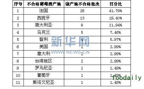 数据显示,在67批次不合格进境葡萄酒名单中,法国、西班牙分别以28批次和13批次大幅“领跑”,共占不合格进境批次的62%。