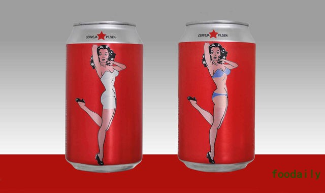 这个显示的方法,听起来很是吸引人:靠模特身上的衣服多少来判断。啤酒罐上的女郎图案原本正儿八经地穿着白色连衣裙,随着啤酒温度降低,白色连衣裙就会逐渐消失,显示出女郎穿着比基尼的样子。广告文案也一语双关地说到: “The cooler, the better”。