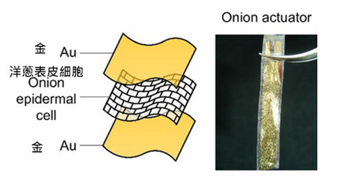 报道说,由台湾大学应用力学所教授张培仁与该校机械系教授施文彬所领导的研究团队,发现洋葱表层细胞的格状结构,经过酸性处理后,施予电击,能有伸缩、延展和弯曲的能力。调整电压大小时,洋葱细胞所做成的人造肌肉会往反方向运动,甚至控制镀金的厚薄,弯曲的程度也有所不同。