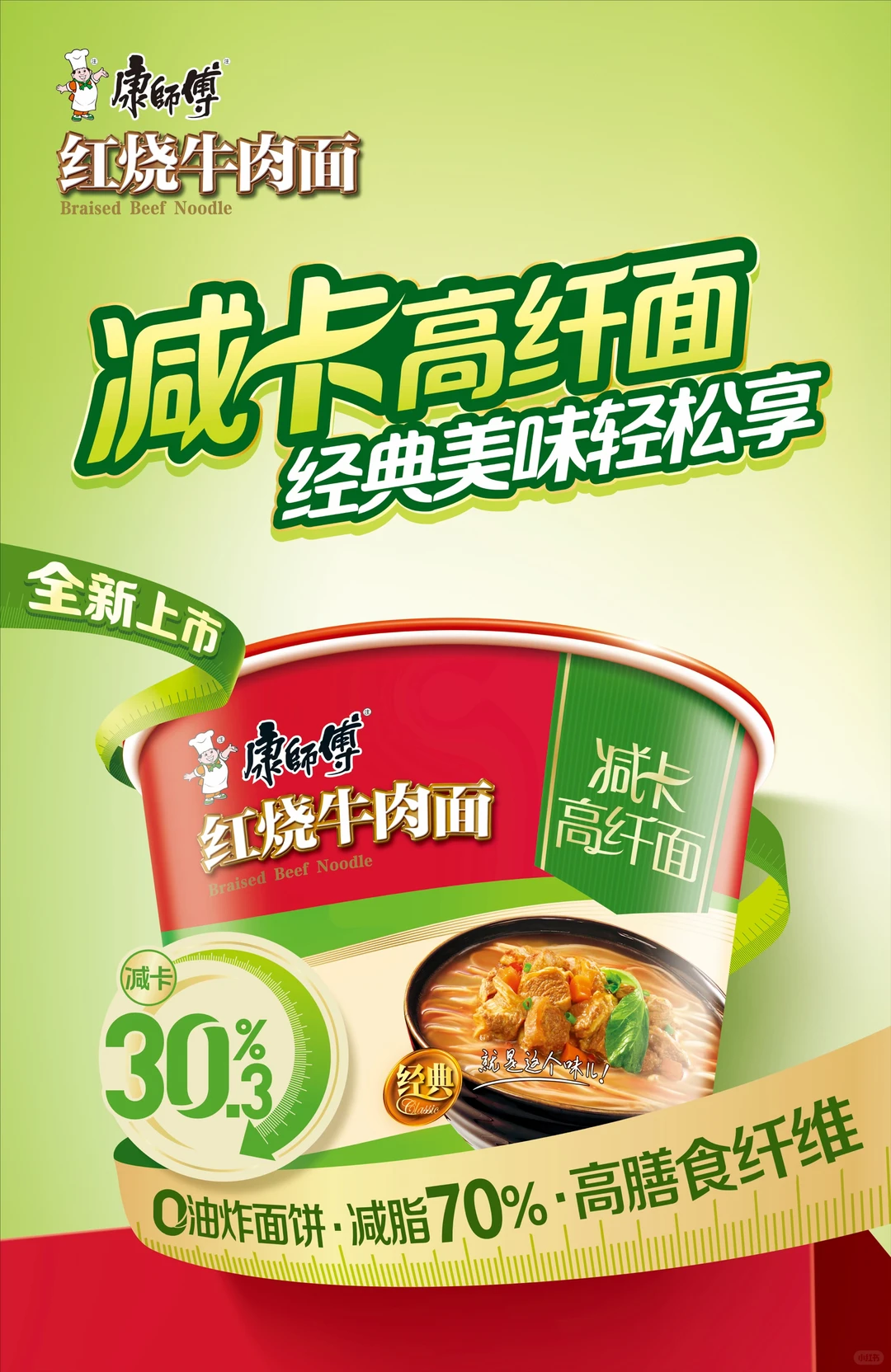 4月27日,康师傅推出「红烧牛肉面减脂高纤面」新品。据官方介绍,新品选用0油炸面饼,相比经典桶面减少30.3%的热量和70%的脂肪,膳食纤维含量为11g/100g,口感清爽不油腻。