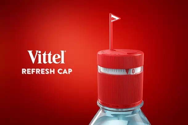 矿泉水品牌Vittel了解到这种现状,和巴黎奥美合作,为不爱喝水、太忙总是忘记喝水的人群推出了自带提醒装置的矿泉水!原理并不复杂,就是一个倒计时器。当时间倒数完毕,瓶盖上会俏皮地弹出一面小旗——Pia!该喝水啦!