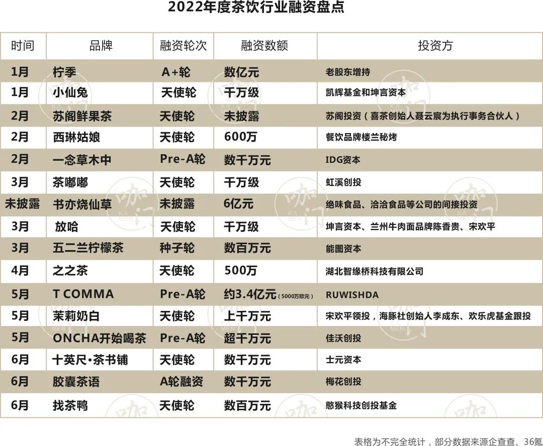 今年上半年,披露出的过亿元融资仅有书亦烧仙草、柠季、T COMMA三个品牌,其余均为千万级、百万级。