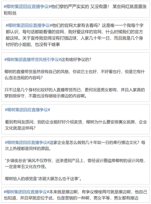 针对椰树集团的“美女式带货营销”是否在打法规的擦边球,网友争论了起来。有网友称椰树集团的营销“一直行走在擦边最前沿”,也有网友认为,“人家几十年如一日已经形成特有的风格”。