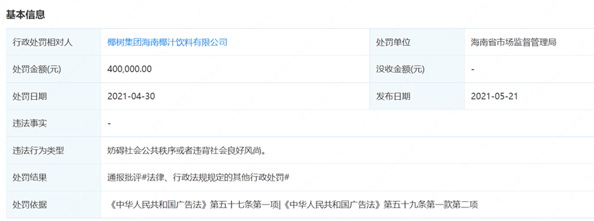 同月,海南省海口市龙华区原工商局认定,椰树椰汁广告违背社会良好风尚,对椰树集团海南椰汁饮料有限公司作出罚款20万元的行政处罚。