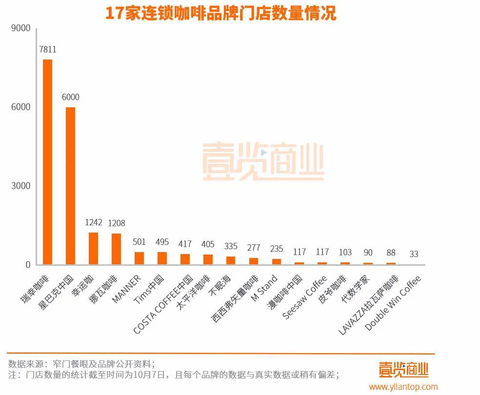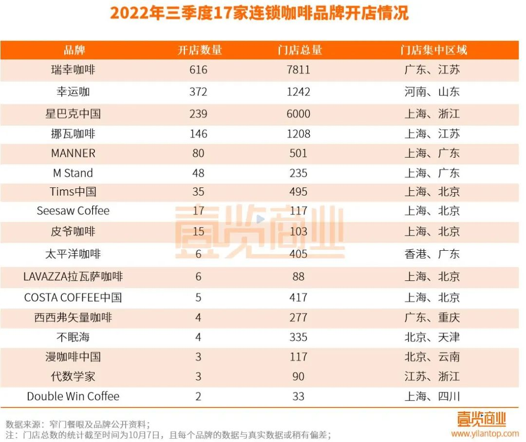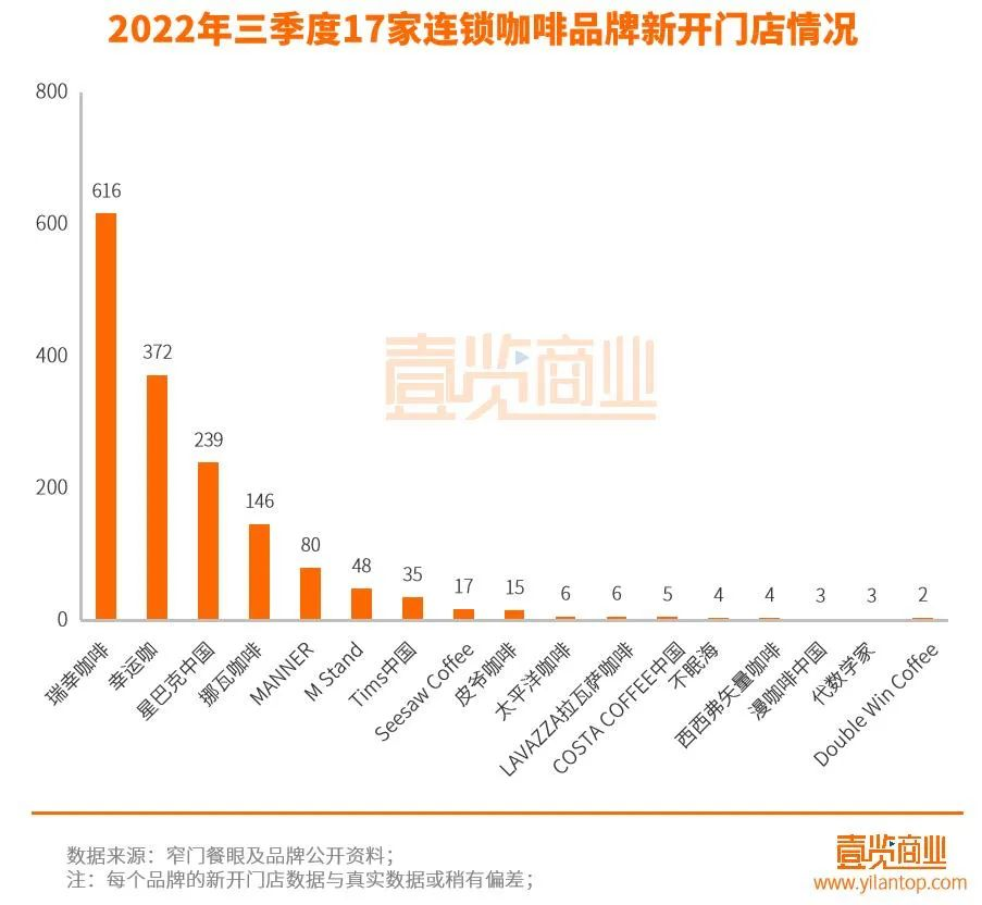 据壹览商业不完全统计,第三季度,瑞幸咖啡新开门店约616家,是其后两家咖啡品牌同期新开门店数量的总和。截至10月7日,瑞幸咖啡全国门店总数达到约7811家,超第二名星巴克中国约1800家。