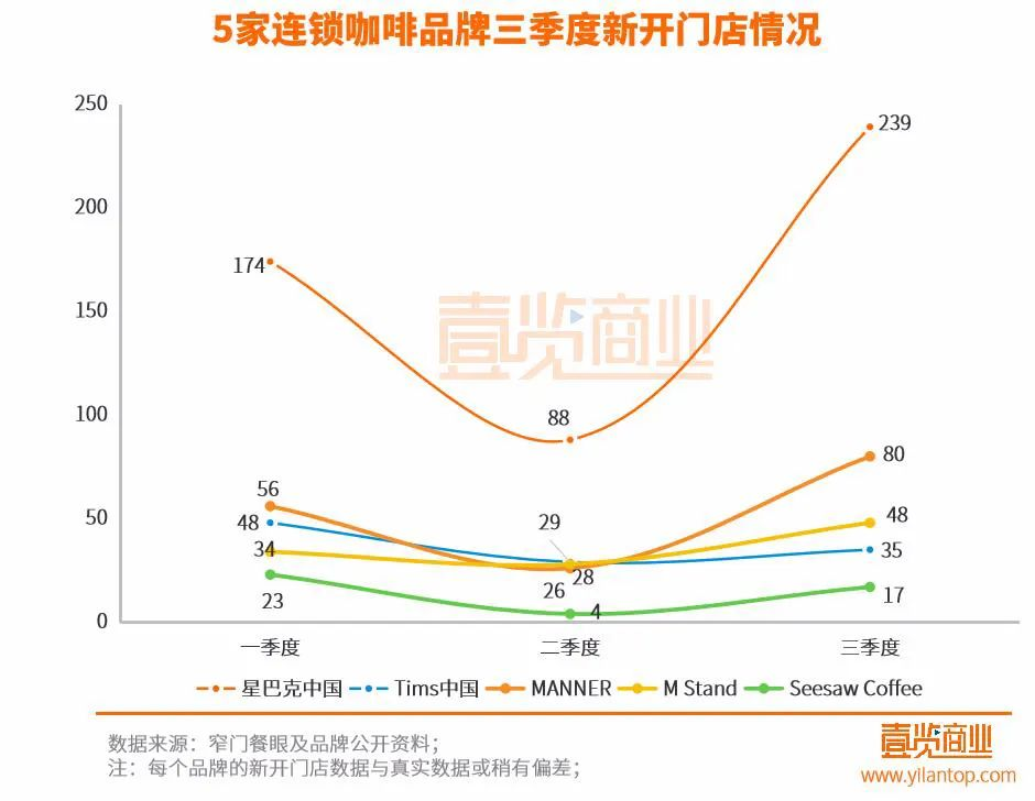 其中,MANNER新开门店80家,与二季度相比增长207.69%;M Stand新开门店48家,与二季度相比增长71.42%;Seesaw Coffe新开门店17家,与二季度相比增长325%;皮爷咖啡新开门店15家,与二季度相比增长275%。