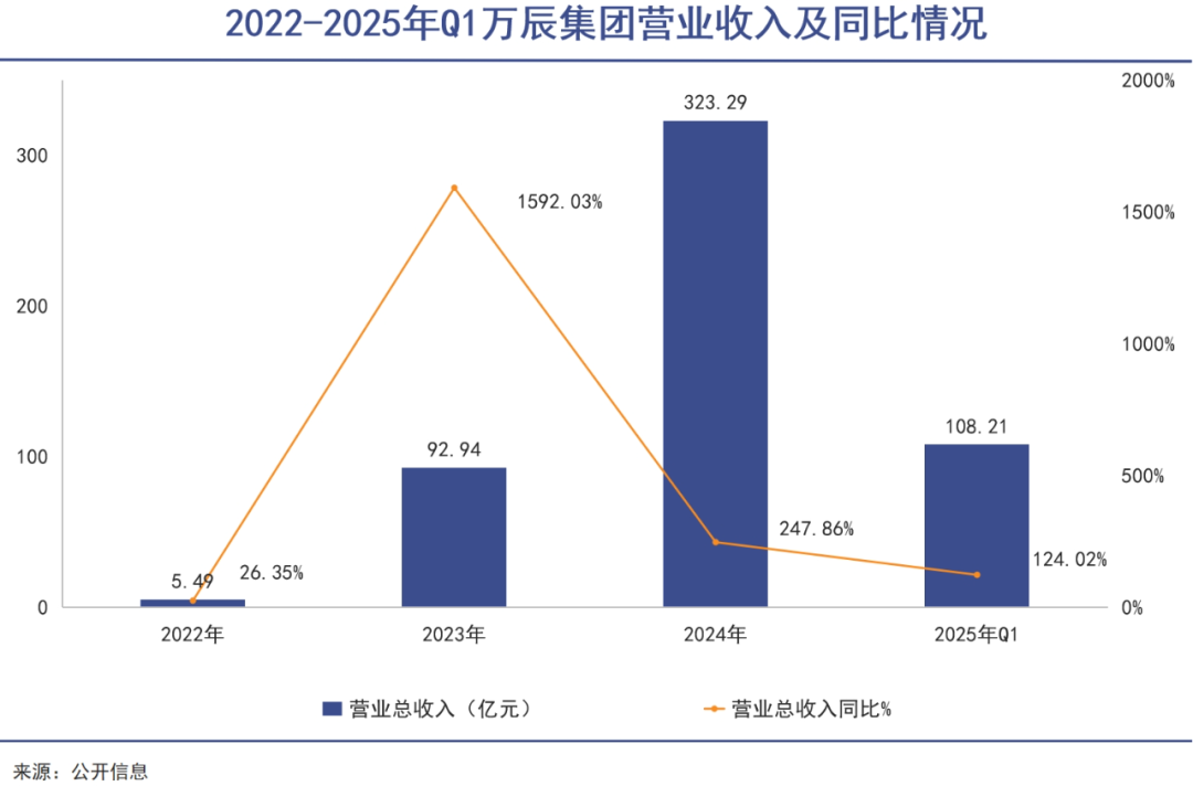 规模效应迅速转化为财务报表的华丽数据。2023年,万辰集团收入从5.49亿元暴涨1592.03%至92.94亿元;2024年,万辰集团继续高歌猛进,营收323.29亿元,同比增长247.86%。净利润2.94亿元,暴增453.95%。