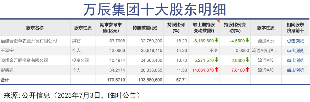 而且在减持完成后,王泽宁和其控制的福建含羞草、漳州金万辰,仍是万辰集团的前三大股东。王泽宁仍是无可争议的公司实控人。