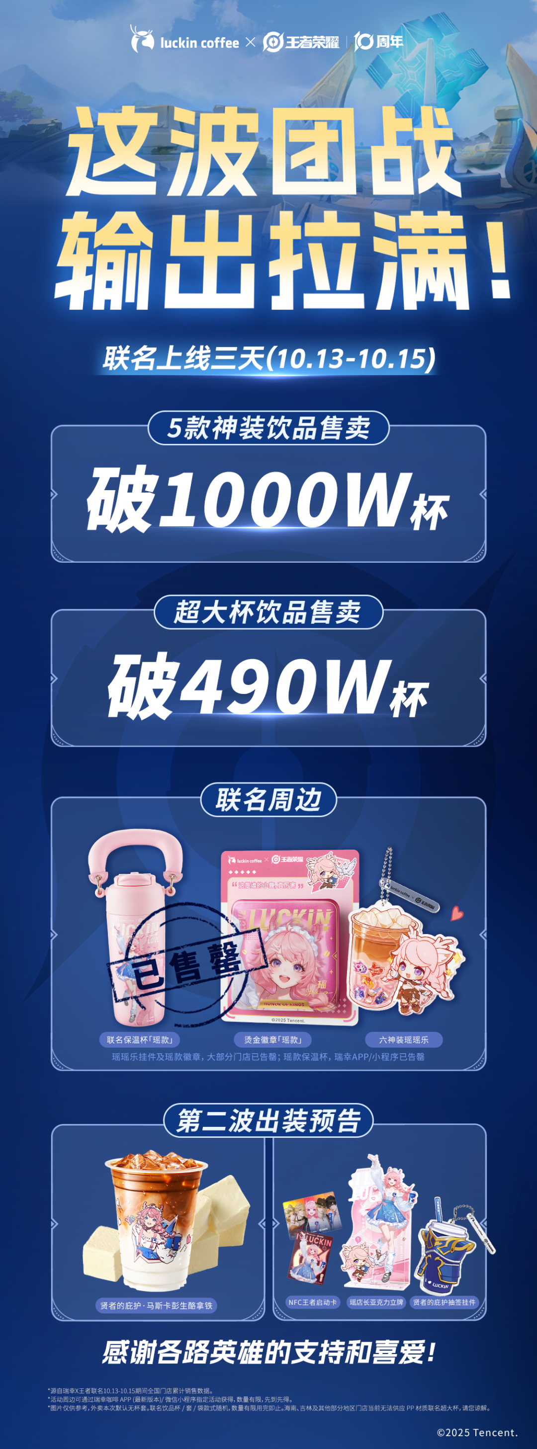 游戏联动茶饮咖啡已经成了行业惯例,往往放在游戏版本的重要节点,玩法高度成熟,联名战报也和周年庆的流水同样诱人。瑞幸联名《王者荣耀》,五款联名饮品在三天内销量杯数突破千万。奈雪联动《如鸢》,有报道显示部分门店单日营业额暴涨近700%。