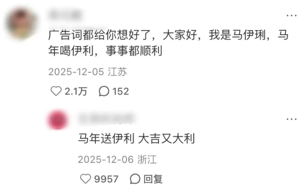 广告圈迎来了它最有创意的一批网友,这届网友还是太有活了,专业程度简直让乙方策划都直呼压力山大,广告人真的可以来评论区取取经了。有网友建议直接抢人:“马伊琍,马年让伊利没办法畅意”,但是这位网友你是不是忘了,畅意是伊利的子品牌啊!!!