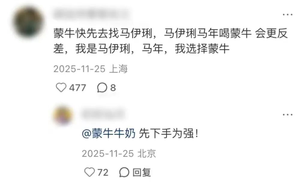 当然,也有网友反其道而行之,来了一招预期违背,让蒙牛请马伊琍代言:“蒙牛快先去找马伊琍,马伊琍马年喝蒙牛,会更反差,我是马伊琍,马年,我选择蒙牛。”