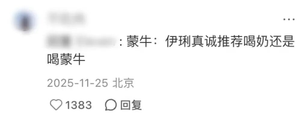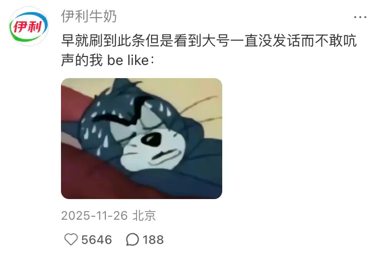 伊利牛奶:“早就刷到此条但是看到大号一直没发话而不敢吭声的我 be like 。”