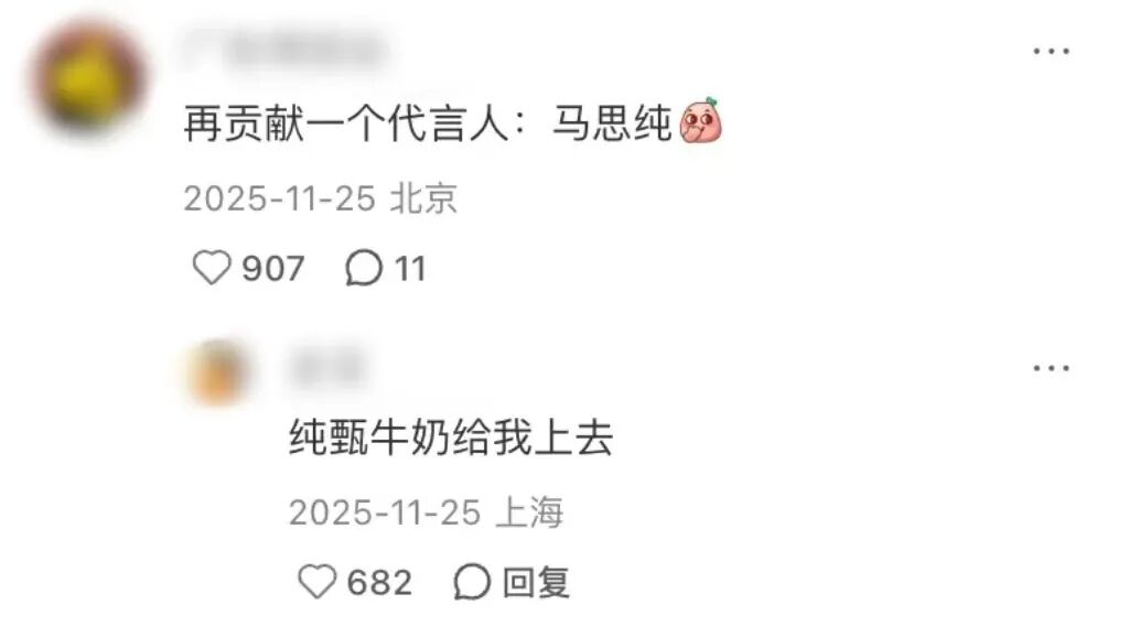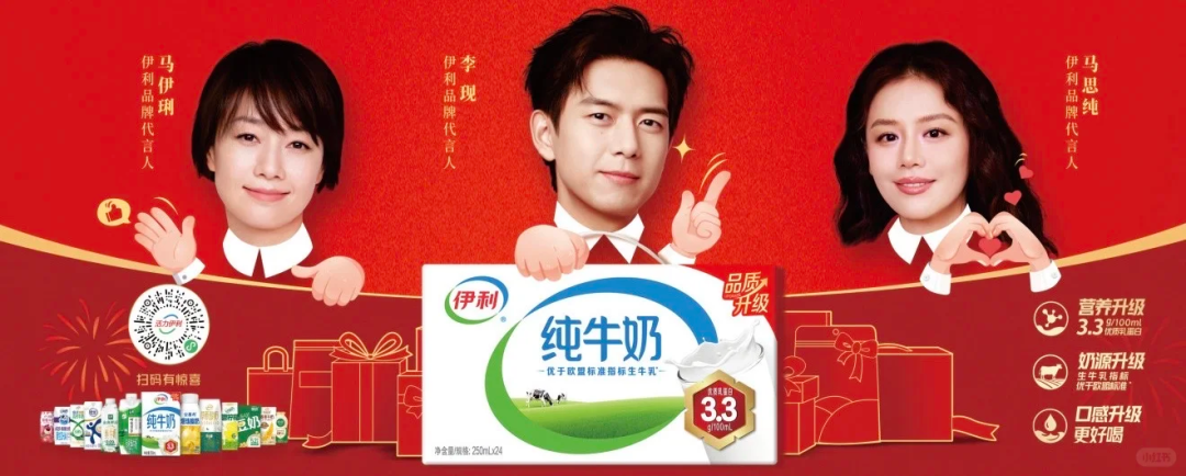 但是没想到,马伊琍没来,马思纯倒是真来了!伊利不负众望,率先官宣马思纯成为伊利品牌代言人,一起在「马年思念纯牛奶」。真别说,这句 slogan 也属于是天赋点全押在传播学上了,不仅拆解了代言人的名字,还那么上头好记,本青年已经被洗脑了。