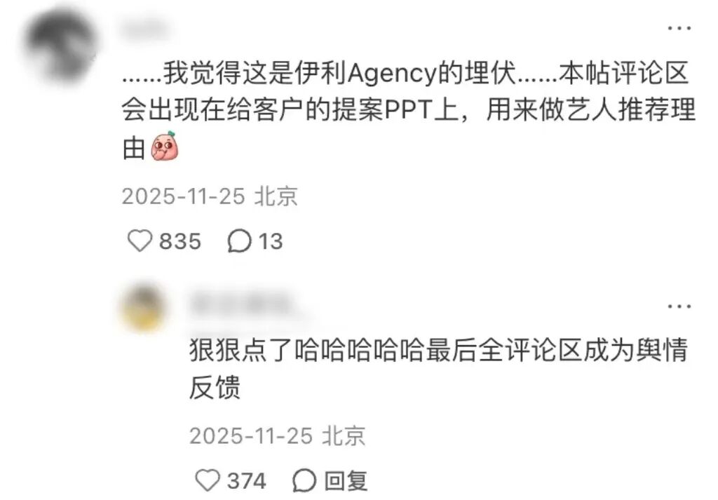 。这不禁让本广告人合理怀疑,这是伊利 Agency 的埋伏,本帖评论区会出现在给客户的提案 PPT 上,用来做艺人推荐理由,全评论区都是舆情反馈。