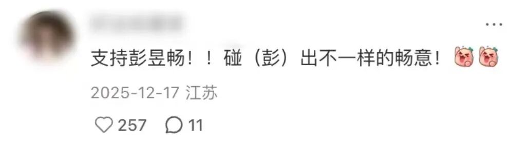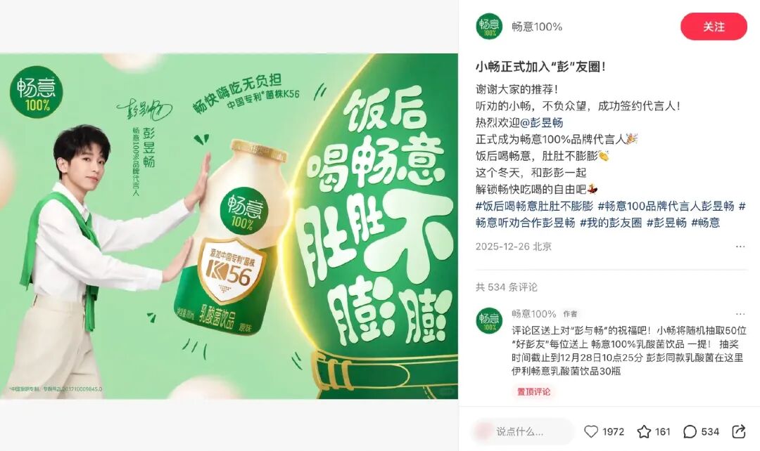 畅意也是模范听劝选手,没过多久就真官宣了彭昱畅作为品牌代言人,正式加入“彭”友圈:“饭后喝畅意,肚肚不膨膨。”