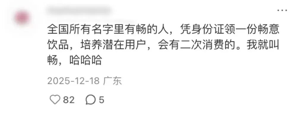 策划人上线了,直接为畅意输出了完整活动方案,建议全国所有名字里有畅的人,都能凭身份证领一份畅意饮品,目的是培养潜在用户👍🏻。低成本获客+社交传播+用户绑定一条龙,高手在民间啊,你有如此成熟的活动策划进入畅意,记住是评论区网友给出的原理。