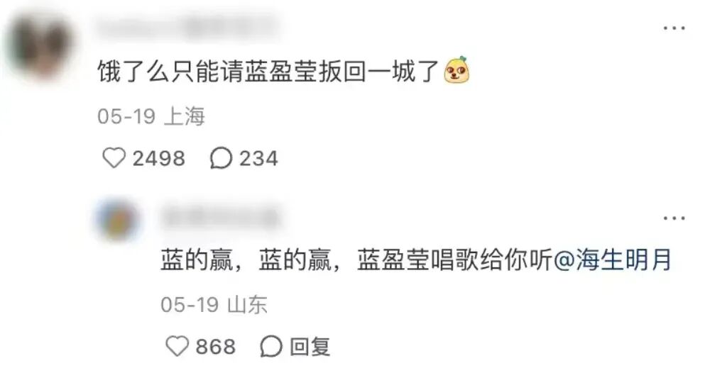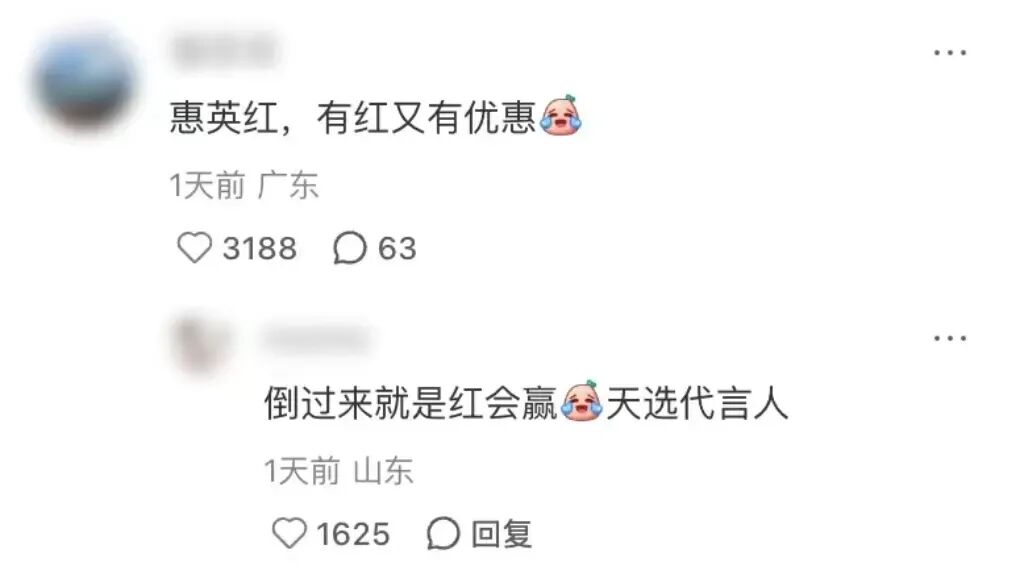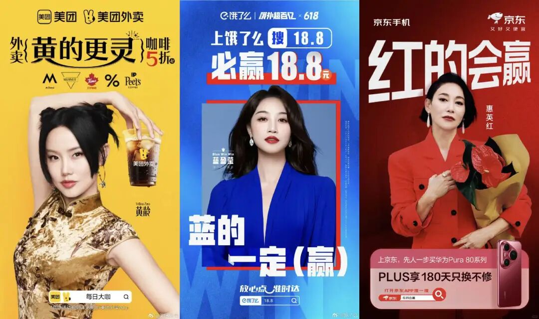 于是在网友的献计献策下,这场外卖代言人展开了谐音梗+品牌色的连续剧:“饿了么只能请蓝盈莹扳回一城了”、“惠英红,(京东)又红又有优惠”。