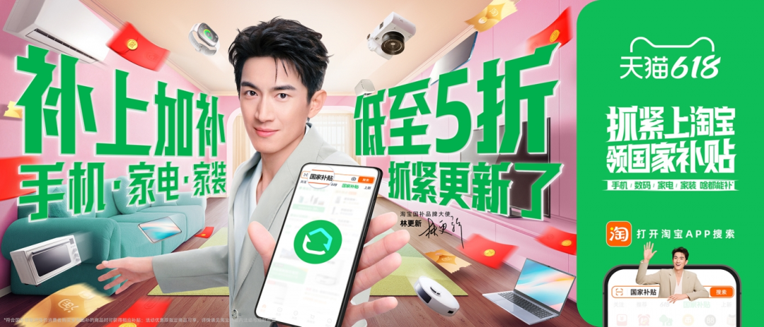 去年 618 期间国补的风越吹越猛,于是淘宝直接祭出了谐音梗大招,邀请林更新作为淘宝国补品牌大使,来告诉大家“抓紧更新了”。
