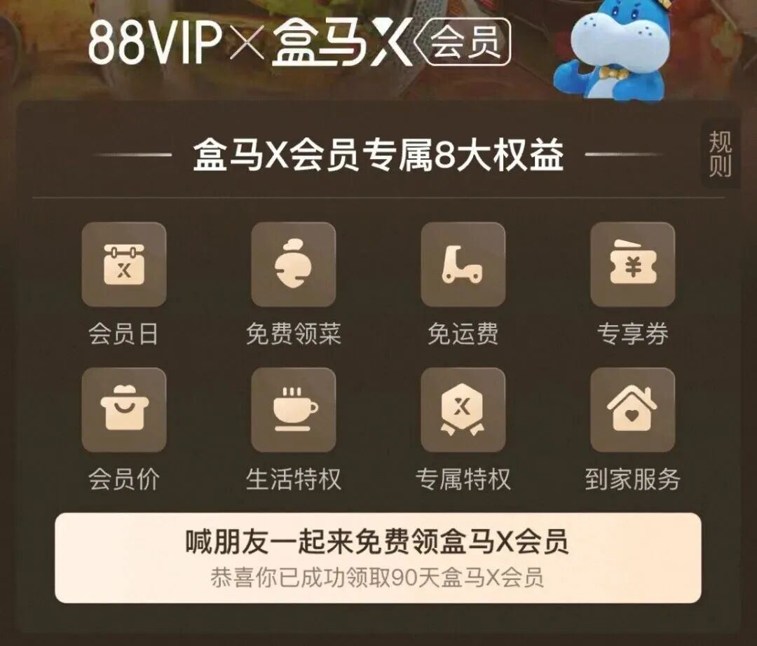 在25年8月,88VIP会员体系升级,可以免费领取90天盒马X会员权益,还可以88元获得盒马X会员,蒋凡宣称,盒马X会员在三日内翻倍。