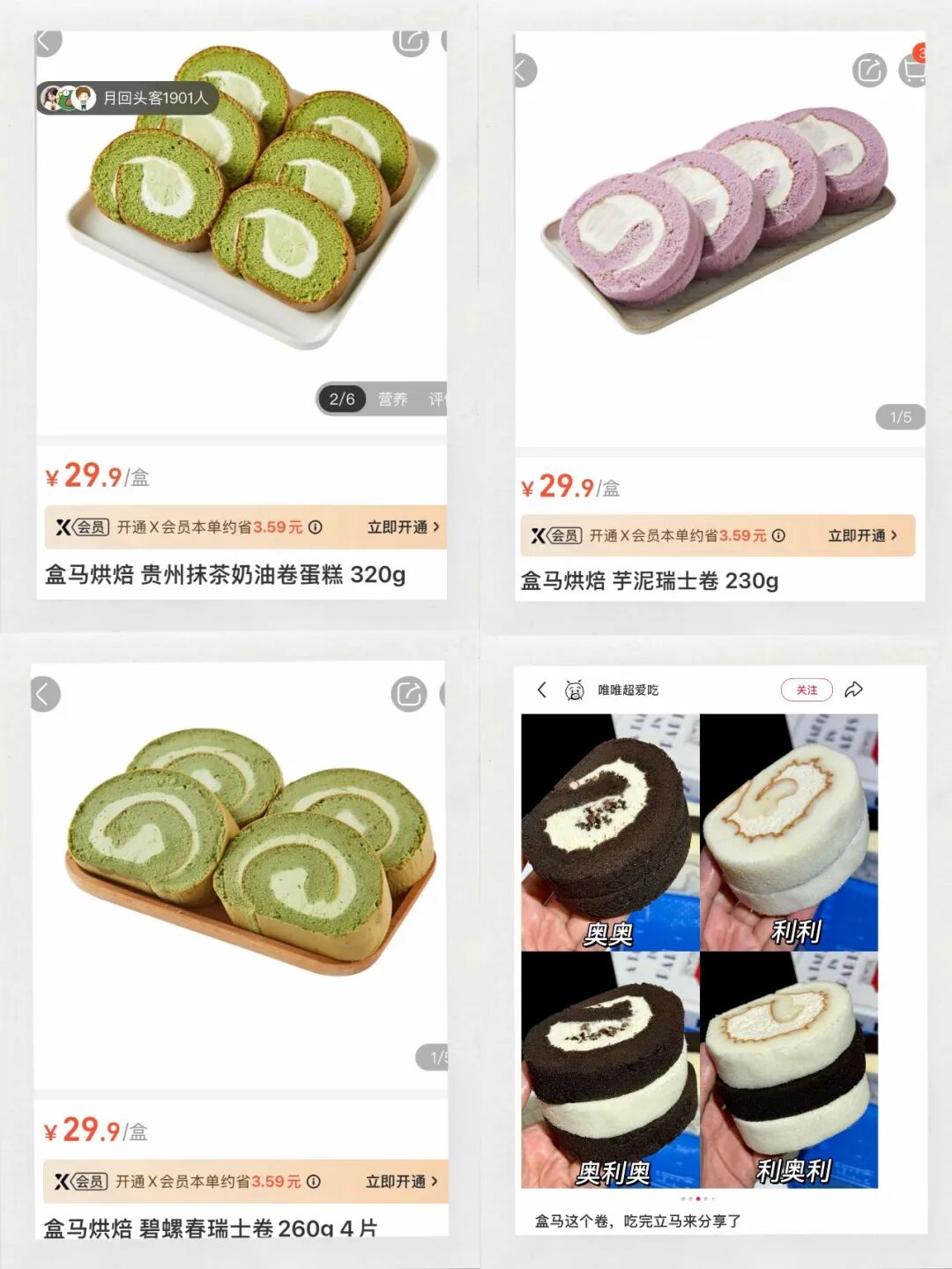 图为盒马的瑞士卷系列产品(部分)(图源:小红书ID: @小小蛋黄酥 @唯唯超爱吃)