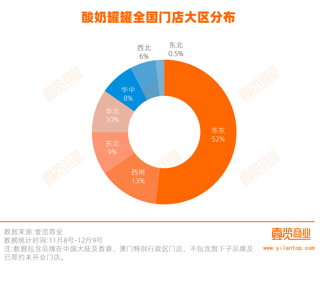 数据印证了这一判断。据茶咖观察统计,11月8日至12月9日期间,酸奶罐罐关闭52家门店,其中新一线城市关店数量占闭店总数的28.85%,且高达86.54%的门店位于购物中心。