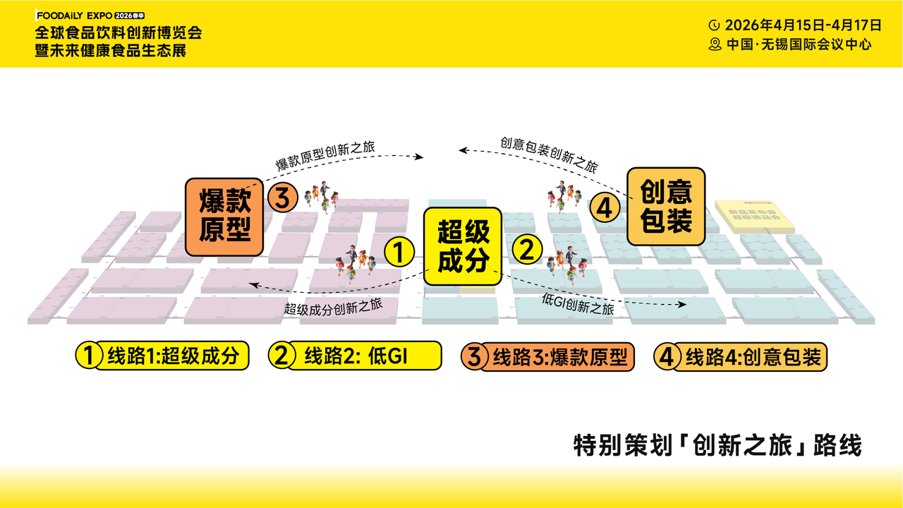 展会现场人头攒动,但无效穿梭往往导致商机错失。Foodaily「创新之旅」活动特别规划了4条主题直播逛展线路,由行业专家带队,从“超级成分”“爆款原型”“创意包装”三大主题展区切入,串联起趋势解读、产品深度体验与企业面对面交流三大环节。