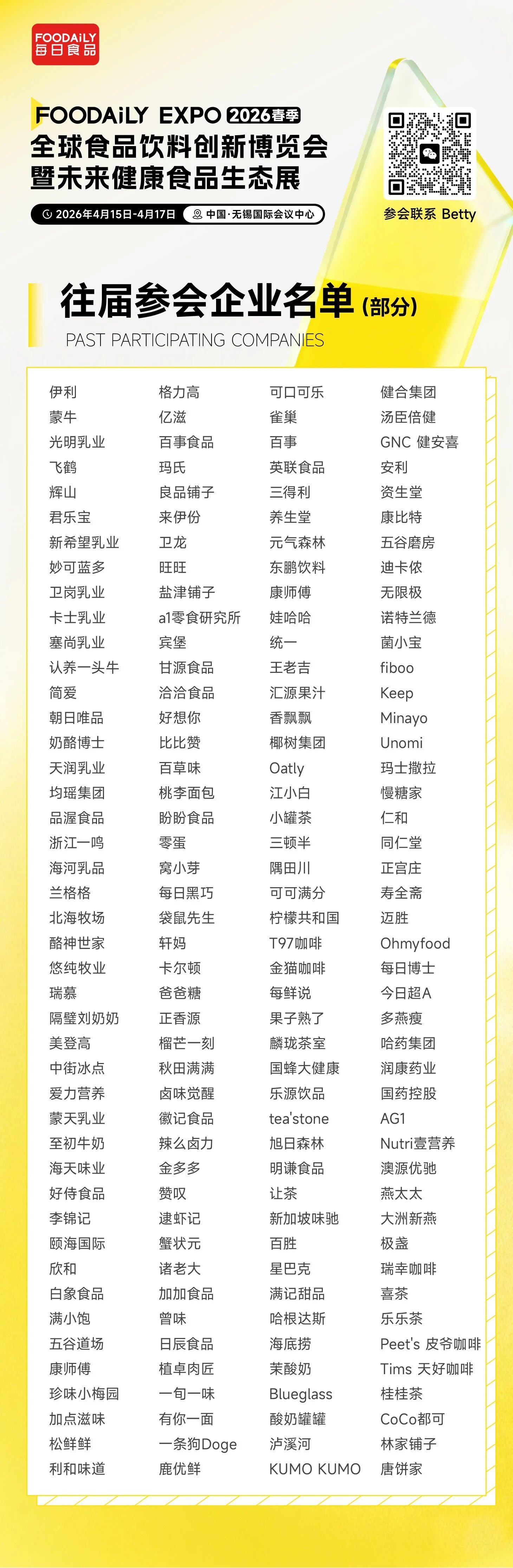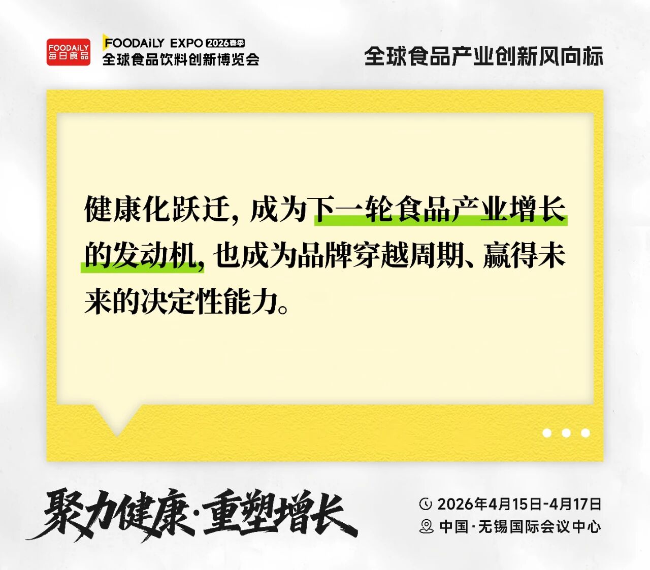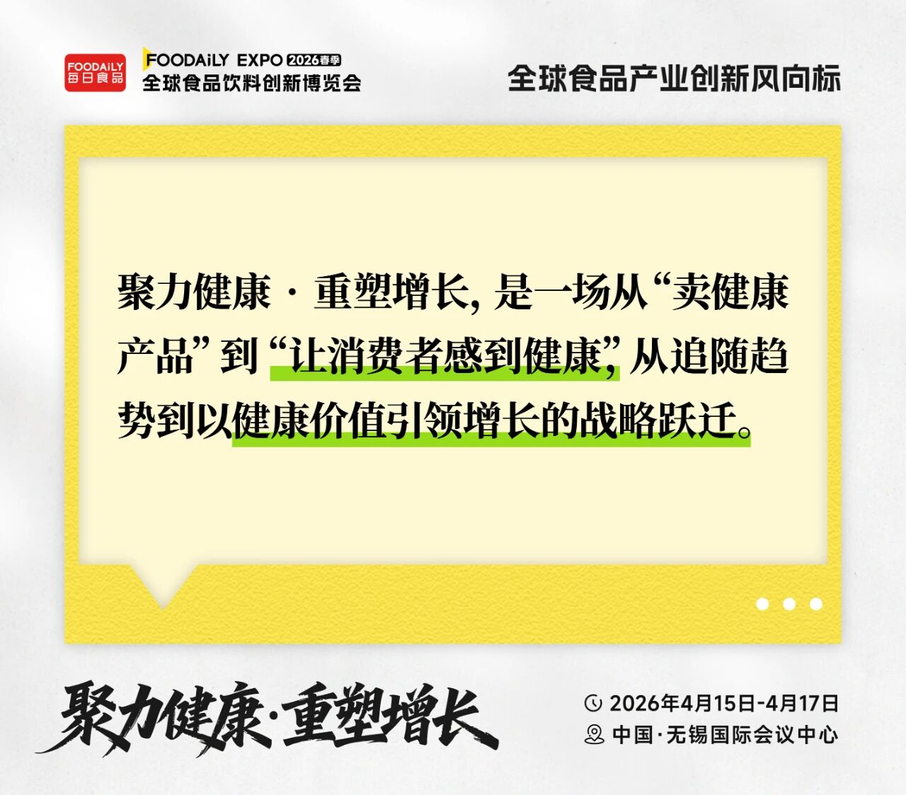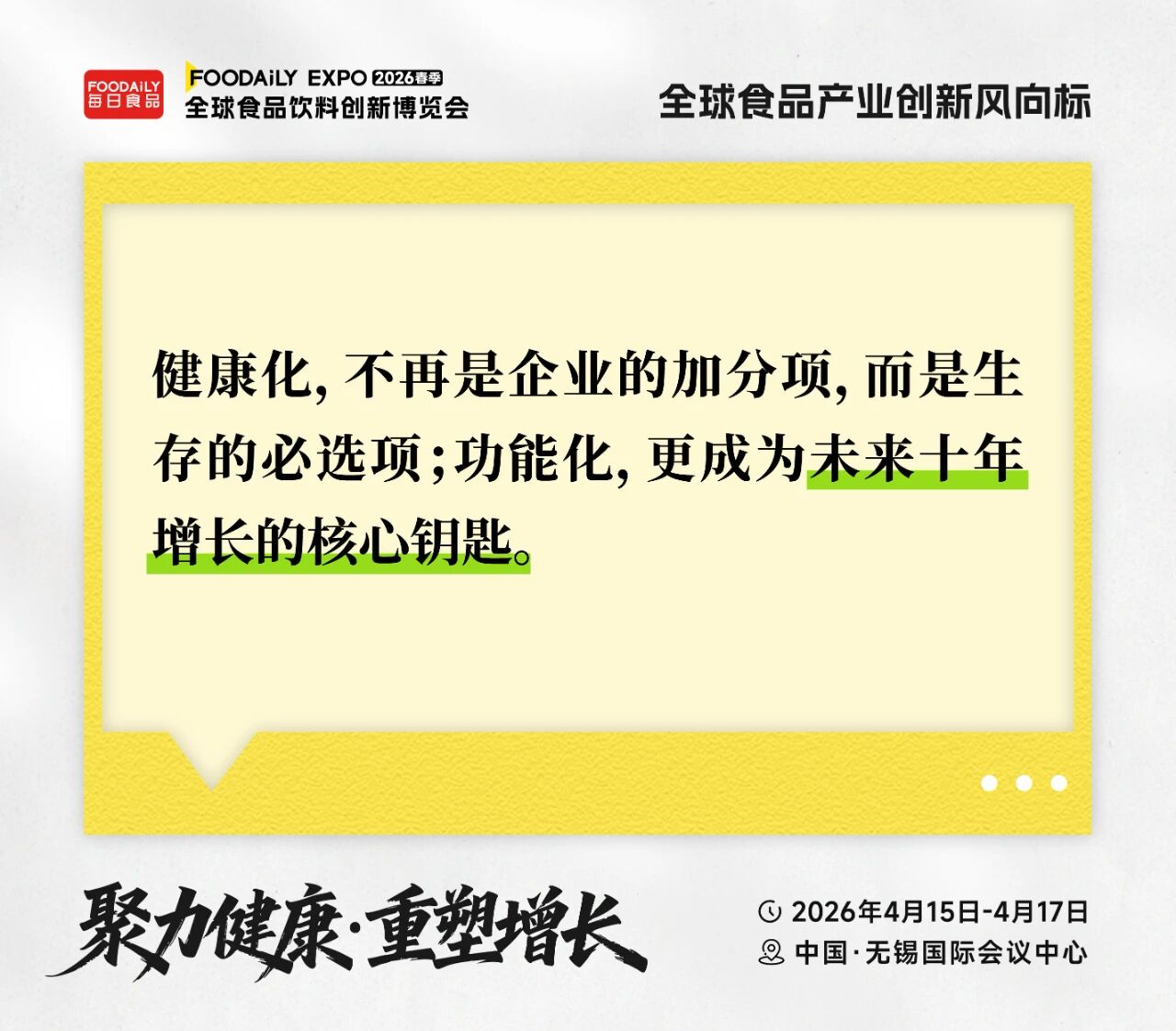 2026年4月15日-17日,中国·无锡国际会议中心,期待在Foodaily创新博览会与您相见,所有决定未来健康食品走向的关键力量,都将在此相遇!