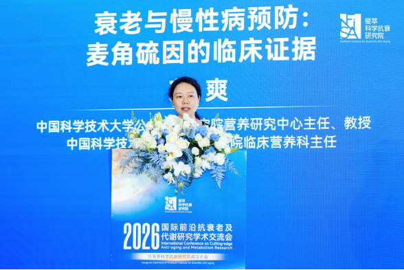 中国科学技术大学公共卫生研究院营养研究中心主任、教授、中国科学技术大学附属第一医院临床营养科主任荣爽在题为《衰老与慢性病预防:麦角硫因的临床证据》的演讲中,聚焦麦角硫因在抗衰老中的作用,结合人群队列研究,探讨其对认知功能、代谢健康的潜在益处,介绍“脑龄”等新型衰老评估指标,并提出未来抗衰老干预应是“结构化、多模式”的生活方式与营养干预相结合。