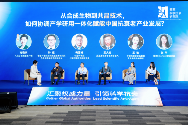 大会圆桌讨论环节,由人民日报健康客户端担任主持方,中国科学院深圳先进技术研究院合成生物学研究所副所长钟超、中国科学院上海药物研究所研究员梅雪峰、庶正康讯市场智库创始人王大宏、中国保健协会抗衰老专业委员会秘书长王畋,以及斐萃FineNutri研发总监张华,作为学界与产业界代表,围绕“从合成生物到共晶技术,如何协调产学研用一体化赋能中国抗衰老产业发展”展开深度的观点碰撞。