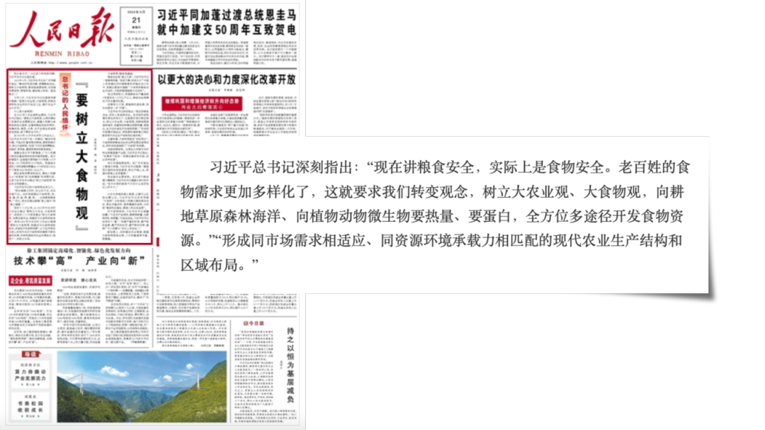 《人民日报》发文强调“树立大食物观”,向植物动物微生物要热量,要蛋白